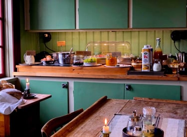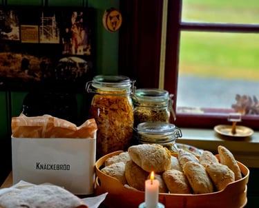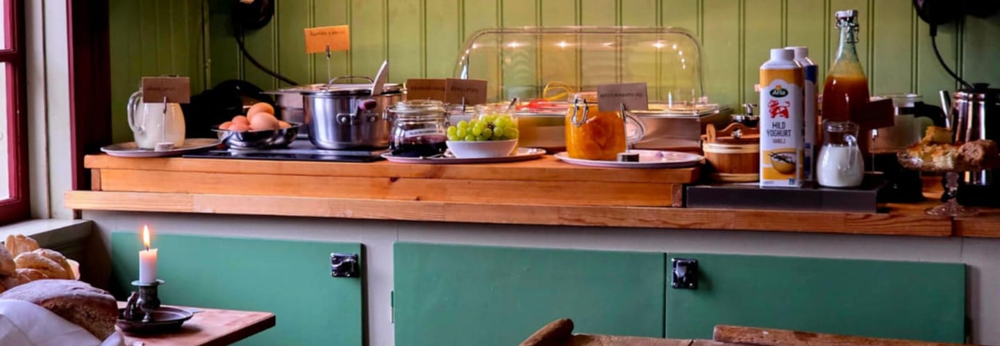 You can enjoy a warm evening meal with dessert, and in the morning we serve a generous breakfast buffet with our own eggs from the farm’s hens, yoghurt, and several types of freshly baked bread. You can prepare your own packed lunch from the buffet.